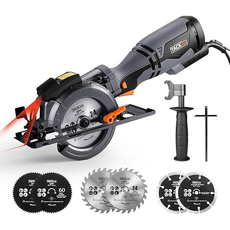 I purchased this circular saw to do some work on my home. I am renovating my house and always used a traditional 6” circular saw that stopped working for me in the middle of my job. I decided to order this 4 1/2” Tack Life saw to see if I would like it better and am so happy I did. This saw feels great in your hand. You have total control of the saw at all times and the cuts are easy and accurate. The laser guide works perfect and the adjustability of the blade angle makes any job simple. This saw comes with 6 blades 2 wood, 2 metal and 2 ceramic. I am thrilled with this purchase and giving the Tack Life saw my highest recommendation!